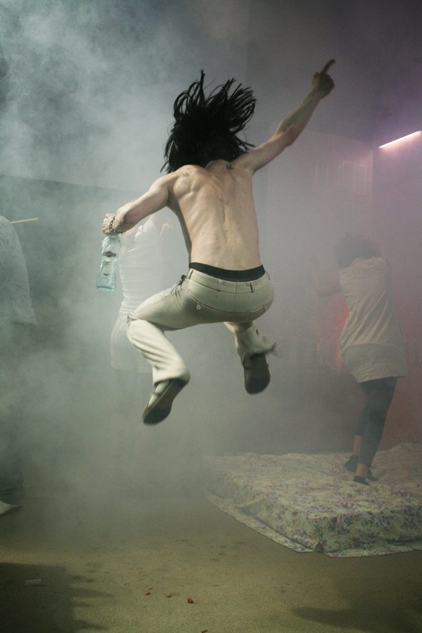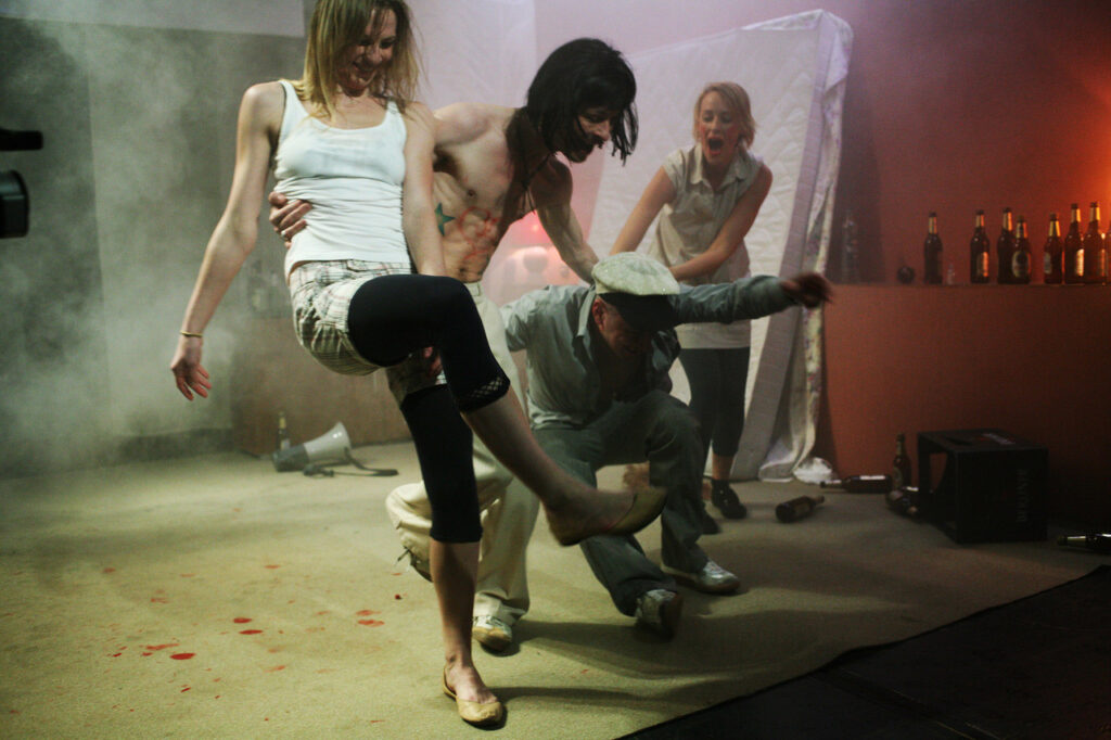 „…Was ich in dieser Szene sehen will ist, wie die Verbrecherbande Alkohol euch im Bewegungszentrum rumpfuschen wird. Ihr seid zwar im Großen und Ganzen noch ihr selbst aber die Grenzen verschwimmen langsam. Beim leichten Rausch geht biochemisch die gleiche Post ab wie beim Sich-Verlieben: Dopamin eimerweise. Euphorie, geminderte Kritikfähigkeit, die Welt in rosarot. Wir sind „Innen Bungalow/ Nacht“. Wir machen’s genauso, wie wir es besprochen haben: Alle sind noch trocken. Trotzdem haben alle ein Abenteuer gebucht. Auch wenn’s bei jedem anders aussieht. Ton ab! Kamera läuft…“