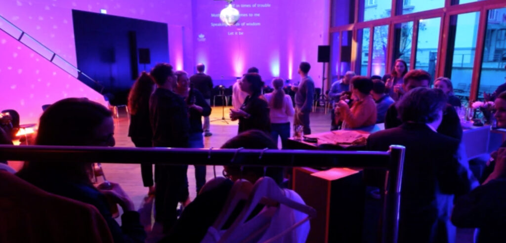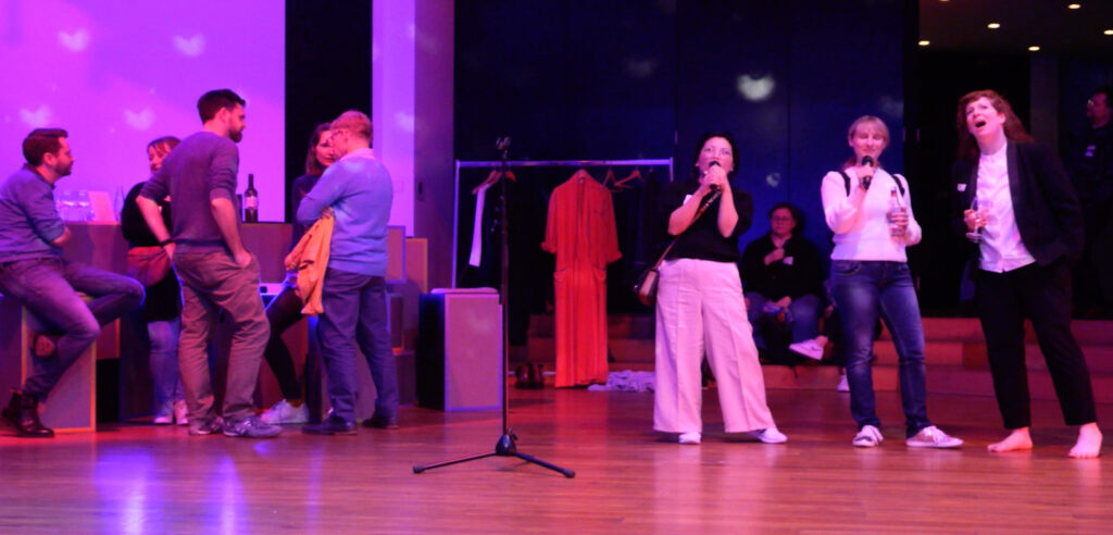 Ein ungewöhnlicher Abend, der mit einer Party endet. Nach dem „Ich für Andere“ im Werkraum Schöpflin singen Künstler und Publikum gemeinsam Karaoke…„Ich möchte nichts verlieren und trotzdem loslassen können“. Wie umgehen mit der eigenen Kinderlosigkeit, Beziehungslo- sigkeit, gefühlten Erwartungen? Darf der eigene Lebensentwurf sein, oder ist das schon Scheitern? Was verändert den Menschen und will er das? Wie umgehen mit dem Tod? „Fühlst du dich noch von der Geburt angeschoben oder schon vom Tod gezogen?“ fragt das Ich. Antworten gibt es keine, aber ein Gefühl von Gemeinschaft im Angesicht dieser geteilten Gedanken. Der Ausklang ist so ungewöhnlich wie der Beginn des Abends, nach all den Gesprächen beginnt der Partyteil des Klassentreffens. Getränke und Snacks werden verteilt, die Darsteller mischen sich wieder unters Publikum, es wird Karaoke gesungen. Nicht nur von Grahs und Talamonti, sondern auch von vielen Gästen. Ein hervorragender Ausklang einer gelungenen Performance.