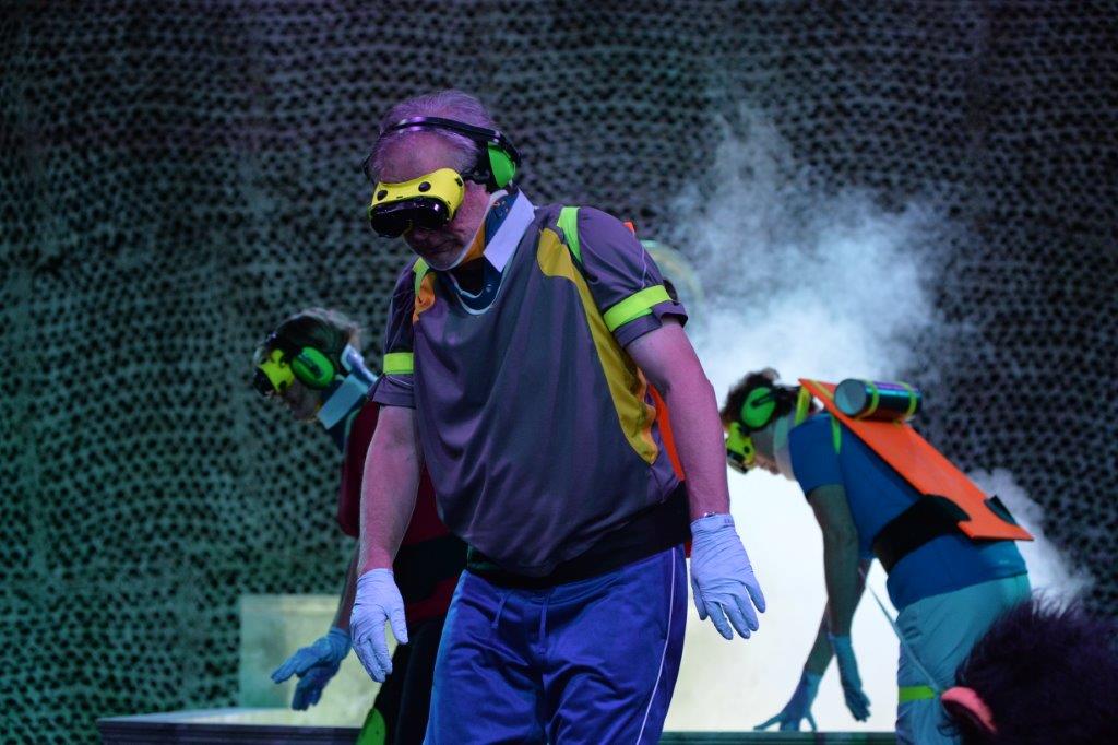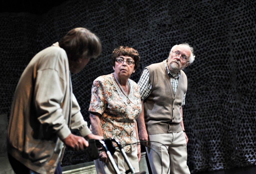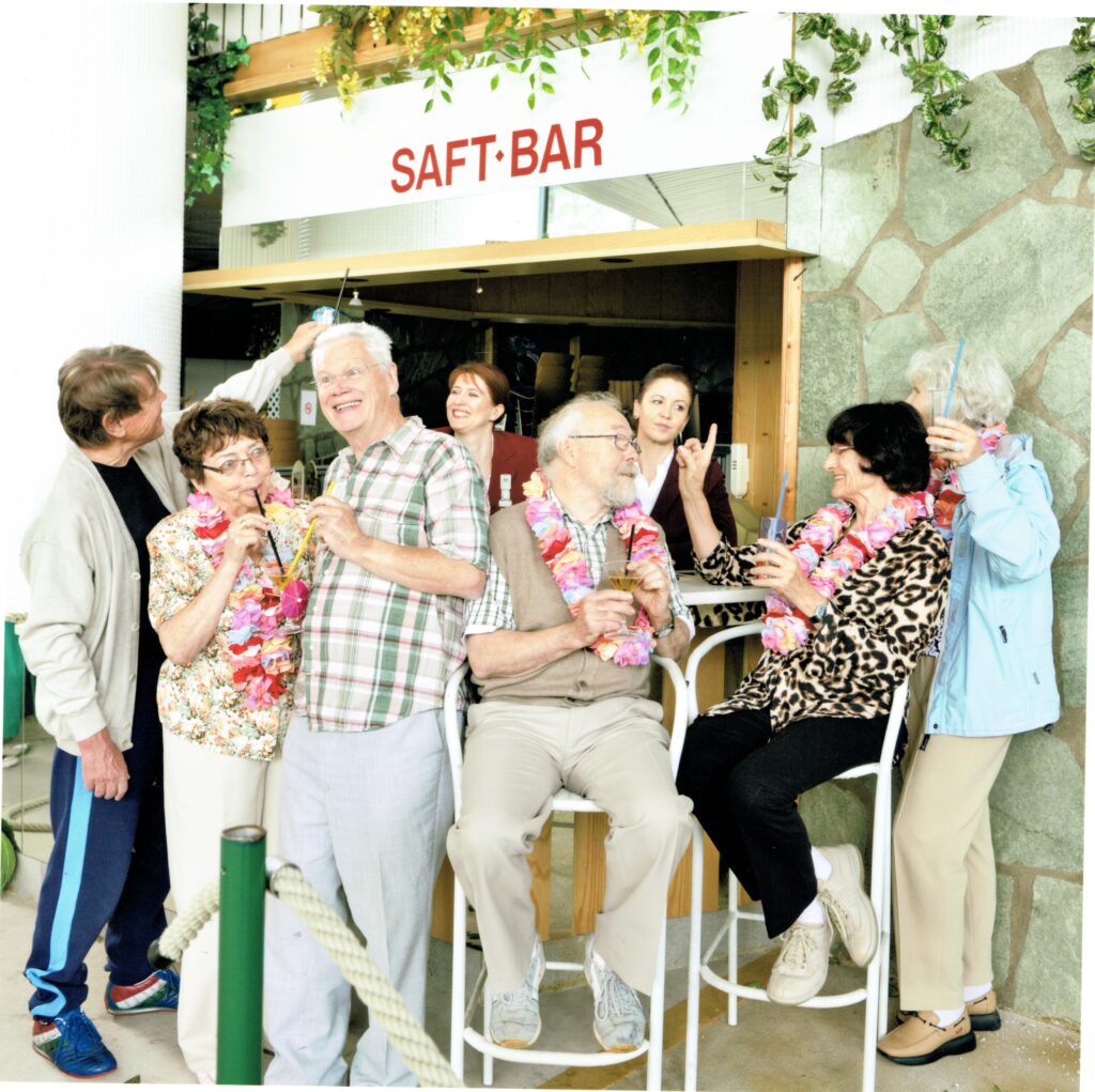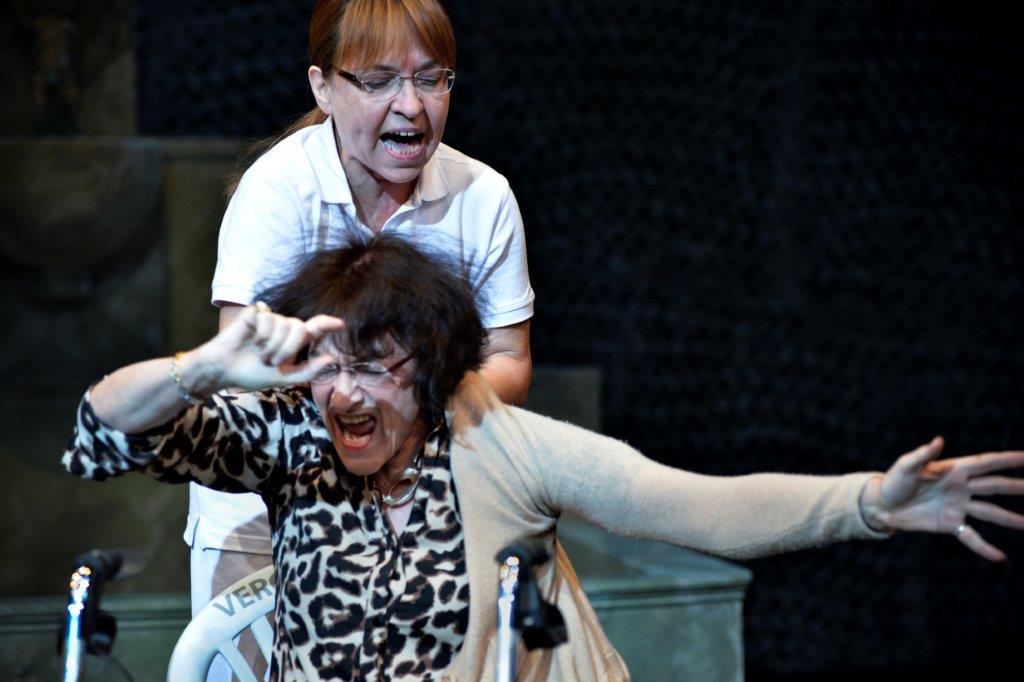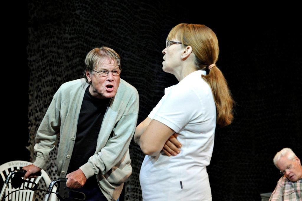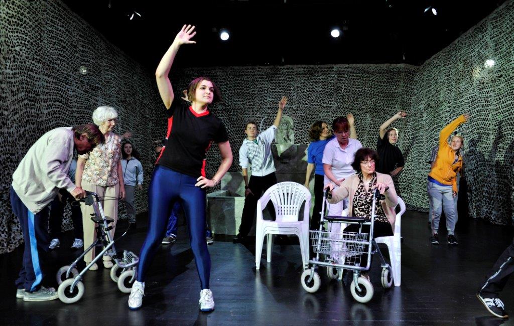 „…von Senioren startet Regisseur Lajos Talamonti seine theatralische Auseinandersetzung über die möglichen Folgen einer alternden Gesellschaft in Deutschland. 23 Bürger-Schauspieler von der elfjährigen Schülerin bis zum 72-jährigen pensionierten Orthopädie-Arzt stellen gekonnt und witzig den Alltag älterer Menschen dar, die in betreutes Wohnen oder Pflegeeinrichtungen abgeschoben sind. Dem folgt eine Auseinandersetzung mit dem Traum vom ewigen Leben und der Verschmelzung von Mensch und Maschine. Es bleibt die „Erkenntnis“, dass das Älterwerden der Gesellschaft Sprengstoff birgt und die auch durch Medikamente immer rüstigeren Alten nicht freiwillig sterben wollen und werden…“